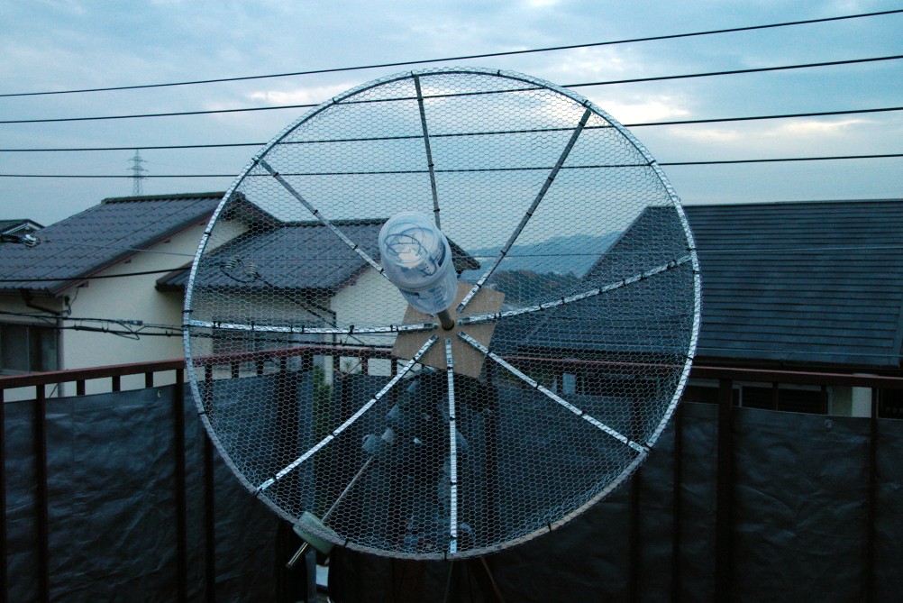 手作り(handmade)のパラボラアンテナ電波望遠鏡で水素が出す波長21cm (約1420MHz)の電波を、ソフトウェア無線(software defined radio) の技術で観測しようという計画。